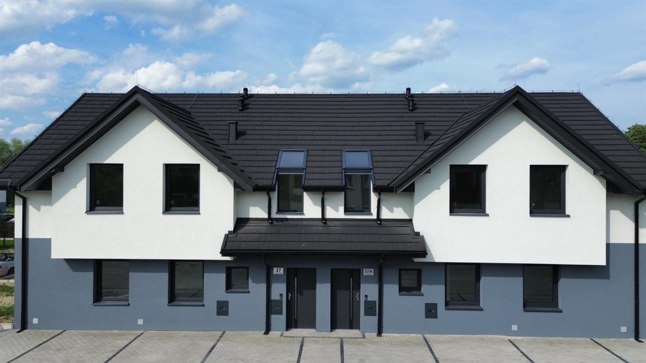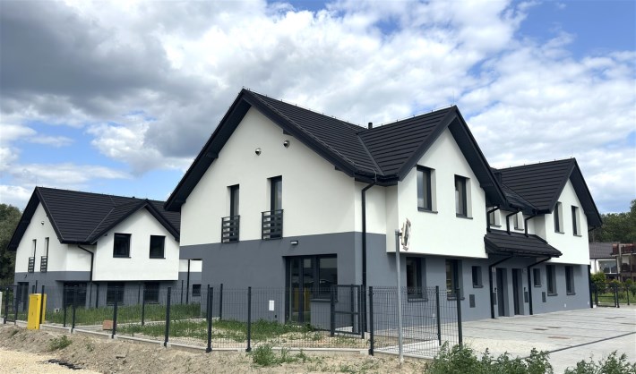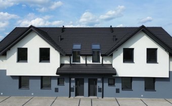 Opis budynku - inwestycja składa się z dwóch budynków jednorodzinnych dwu-lokalowych w zabudowie bliźniaczej, ułożone względem siebie w odbiciu lustrzanym. W każdym budynku cztery lokale posiadają wspólną klatkę schodową. Budynki są niepodpiwniczone, parterowe z użytkowym poddaszem, budowane w technologii tradycyjnej murowanej z pustaków porotherm, z dachem dwuspadowym krytym blachodachówką. Doprowadzone wszystkie media: woda, prąd, gaz, kanalizacja, internet (światłowód).