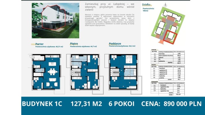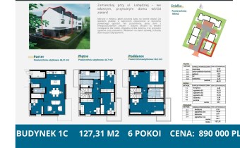 Oferta sprzedaży dotyczy Budynku nr 1C, położonego bezpośrednio przy ulicy Łabędziej- pierwszy budynek od prawej strony. Dom o powierzchni użytkowej 127,31 m2 z dwoma miejscami postojowymi oraz ogródkiem o powierzchni ok.185m2. Bardzo przemyślany projekt z funkcjonalnym układem pomieszczeń. 3 kondygnacje pozwalają na wydzielenie przestrzeni dziennej i nocnej jak również możliwość stworzenia miejsca do pracy /siłowni itp. ….