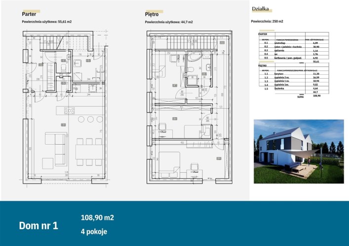 - Powierzchnia użytkowa 108,90 m2, działka ok. 250 m2