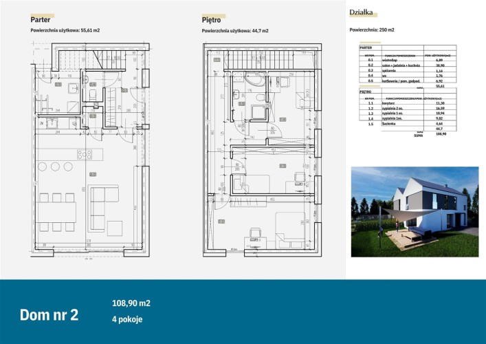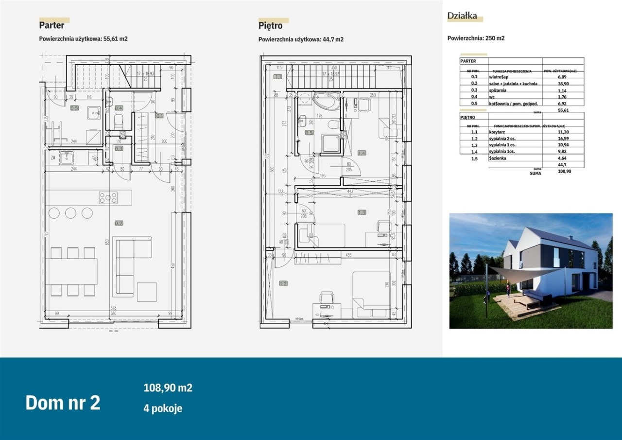 - Powierzchnia użytkowa 108,90 m2, działka ok. 250 m2
