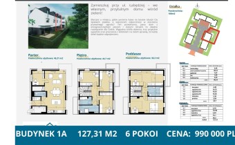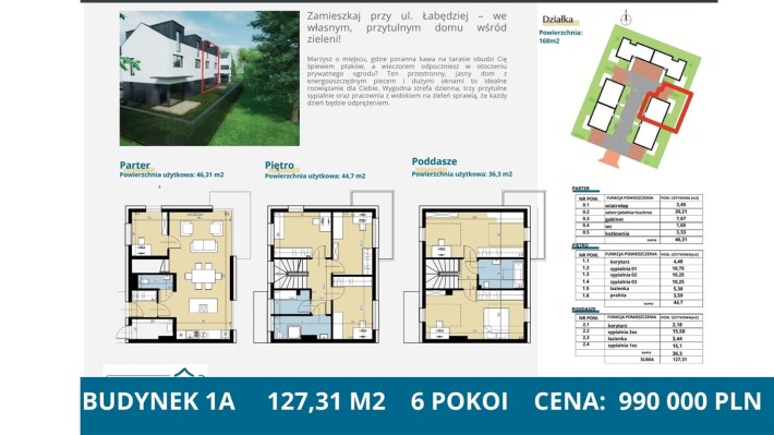 Oferta sprzedaży dotyczy Budynku nr 1B, położonego bezpośrednio przy ulicy Łabędziej- drugi budynek od prawej strony. Dom o powierzchni użytkowej 127,31 m2 z dwoma miejscami postojowymi oraz ogródkiem o powierzchni ok. 168 m2. Bardzo przemyślany projekt z funkcjonalnym układem pomieszczeń. 3 kondygnacje pozwalają na wydzielenie przestrzeni dziennej i nocnej jak również możliwość stworzenia miejsca do pracy /siłowni itp. ….
